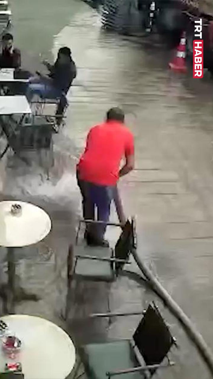 İstanbul’da dükkanının önünü yıkayan esnaf, hortumun kontrolünü kaybedip müşterilerini ıslattı.