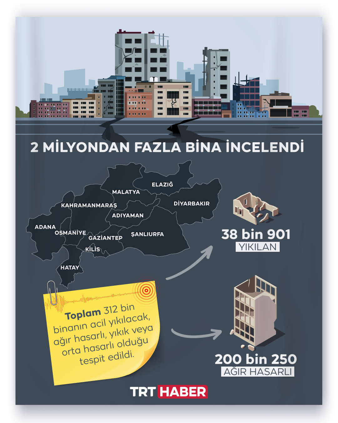 T.C. Çevre, Şehircilik ve İklim Değişikliği Bakanlığı koordinesinde Cumhuriyet tarihinin en kapsamlı hasar tespit çalışmaları başlatıldı. Yürütülen çalışmalarda 38 bin 901 binanın yıkıldığı 200 bin 250 binanın ağır hasar aldığı tespit edildi.